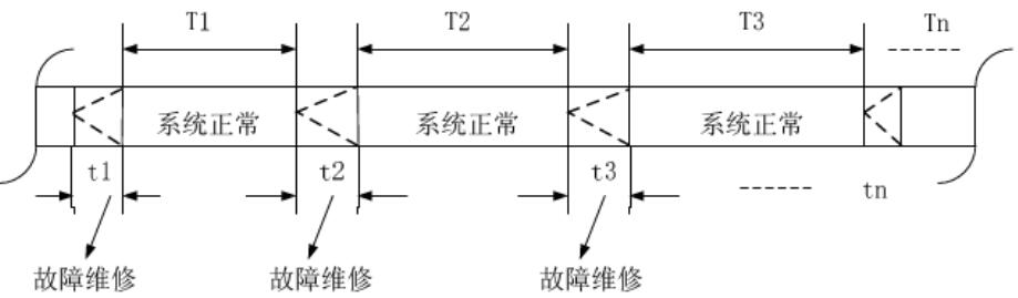 (1)可靠性,指某一時間段內設備或系統連續運行而無故障發生的概率。重要表征參數是平均無故障時間(Mean Time Between Failure,簡稱MTBF)是指相鄰兩次故障之間的平均工作時間,也稱平均故障間隔時間。如圖1所示MTBF= ,系統故障率λ= 1/MTBF。