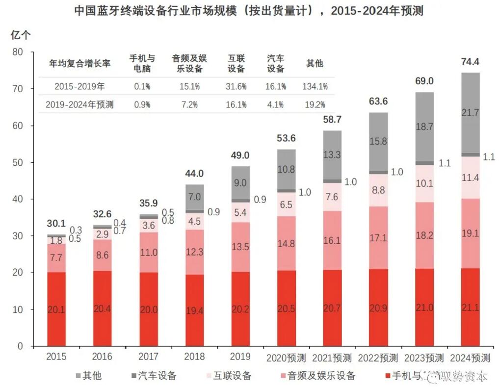 2015年至2020年期間中國(guó)藍(lán)牙終端設(shè)備出貨量穩(wěn)步提升,未來(lái)伴隨藍(lán)牙芯片在各領(lǐng)域滲透率持續(xù)提升,預(yù)計(jì)至2024年藍(lán)牙終端設(shè)備出貨量將達(dá)74.4億個(gè)。