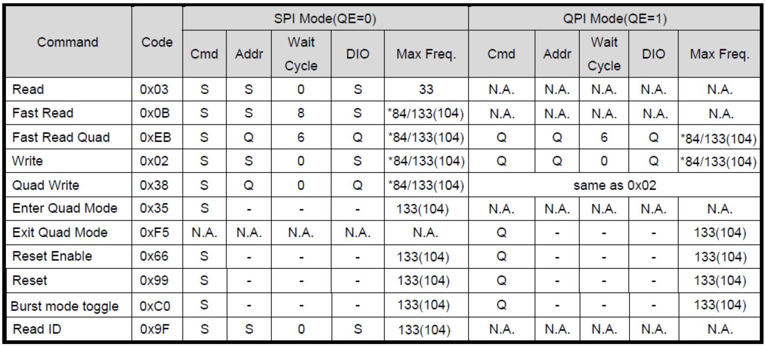 備注:S=串行I/O,Q=四通道I/O。