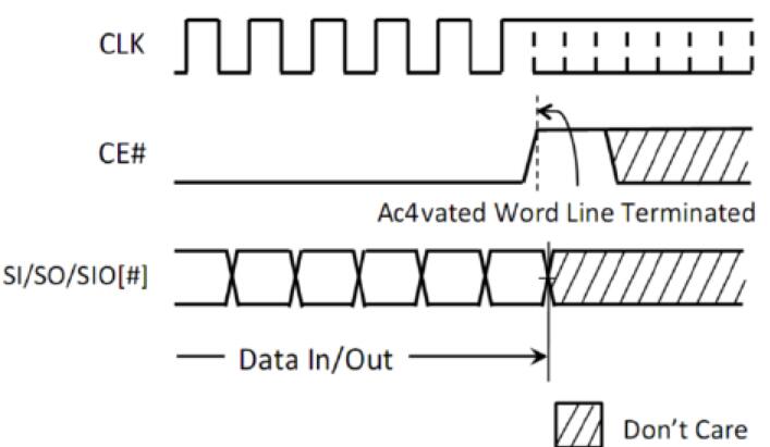 所有所有讀和寫(xiě)都必須由CE#從低到高完成。CK#的上升沿是終止已激活的讀/寫(xiě)字線并將設(shè)備設(shè)置為待機(jī)狀態(tài)的觸發(fā)器,否則將阻止內(nèi)部刷新操作,直到設(shè)備看到讀/寫(xiě)字線已終止,無(wú)需執(zhí)行命令終止操作僅適用于讀取和寫(xiě)入操作以及任何命令操作,例如Enter Quad模式命令和Reset命令。