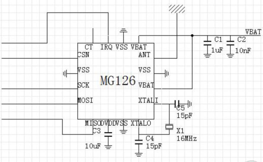 射頻芯片是低功耗、低成本的BLE收發器,內部集成了發射機、接收機、GFSK調制解調器和BLE基帶處理。MG126采用QFN3x3封裝,搭配Cortex-M0 MCU和少數外圍被動器件,可以實現BLE遙控、藍牙鍵盤等數據傳輸應用。電源電壓1.9~3.6,可以采用一個紐扣電池(3.0v)供電,具有3uA待機電流,20mA@0dBm持續發射,18mA持續接收。