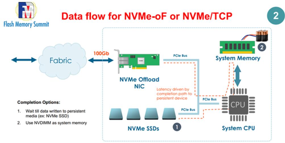 以下圖片是傳統(tǒng)的NVMe-oF的數(shù)據(jù)流,要通過系統(tǒng)內(nèi)存和CPU再進入NVMe SSD,這樣會導(dǎo)致讀寫延遲比較長。