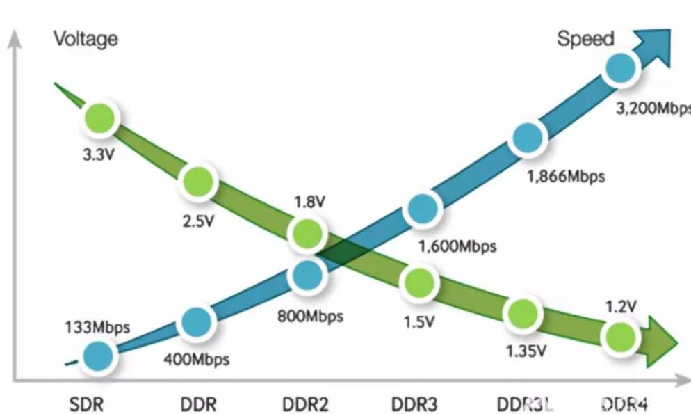 從DDR到DDR4,不同性能參數(shù)差異主要體現(xiàn)在2個(gè)地方:電源電壓、數(shù)據(jù)傳輸速率。電源電壓值越來越低,而數(shù)據(jù)傳輸速率卻是呈幾何倍數(shù)增長。