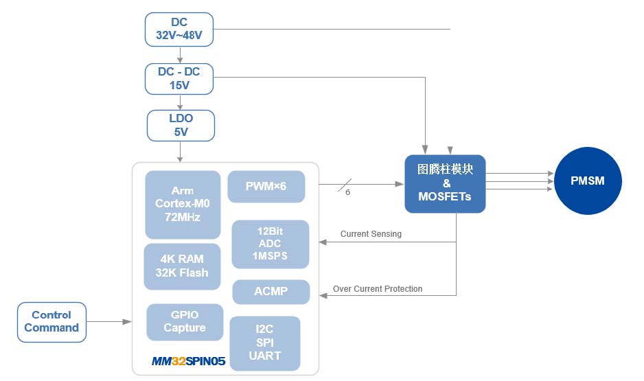 MM32SPIN080C是靈動MindSPIN旗下高性能的單電機控制SOC產品,采用Cortex-M0內核,集成了運動控制所需的專用模擬外設,包括12位高精度ADC、2路模擬比較器COMP、2路運算放大器OPAMP、三相N溝道柵極驅動器,另配備有MC-TIM、硬件除法器HW-Div、DMA控制器等專用資源,以及32KB Flash、4KB SRAM、20個GPIO等基礎資源。