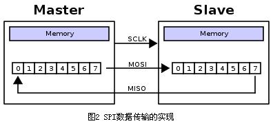 這是通過(guò)移位寄存器來(lái)實(shí)現(xiàn)的。如圖2所示,主機(jī)和從機(jī)各有一個(gè)移位寄存器,且二者連接成環(huán)。隨著時(shí)鐘脈沖,數(shù)據(jù)按照從高位到低位的方式依次移出主機(jī)寄存器和從機(jī)寄存器,并且依次移入從機(jī)寄存器和主機(jī)寄存器。當(dāng)寄存器中的內(nèi)容全部移出時(shí),相當(dāng)于完成了兩個(gè)寄存器內(nèi)容的交換。