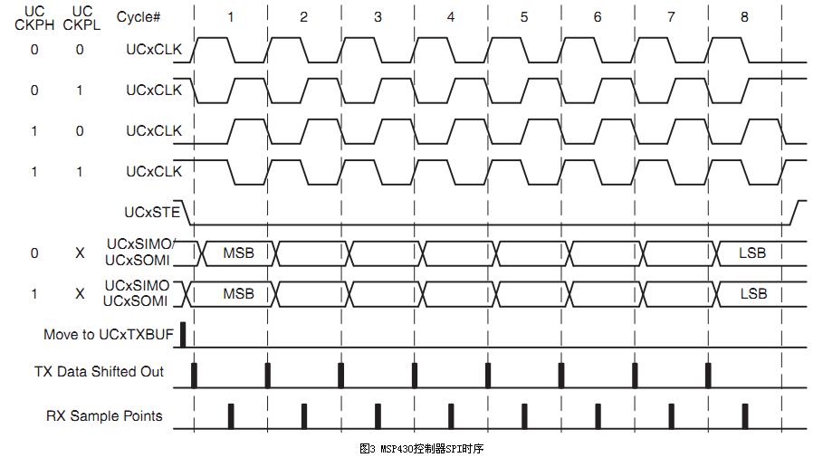 舉例來(lái)說(shuō),分別選取MSP430控制器和OLED驅(qū)動(dòng)SH1101A為主從機(jī),圖3和圖4為它們的SPI時(shí)序。由圖4可知,SH1101A的SPI時(shí)鐘空閑時(shí)為高電平,并且在后時(shí)鐘沿接收數(shù)據(jù),則MSP430控制器SPI的設(shè)置應(yīng)與此保持一致。從圖3中可以看出,要使得時(shí)鐘在空閑時(shí)為高電平,應(yīng)將UCCKPL置1;要使得在后時(shí)鐘沿接收數(shù)據(jù),應(yīng)將UCCKPH清零。