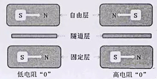 如下圖二所示,MTJ有三層,最上層為自由層,中間是隧道結(jié),下面是固定層。自由層的磁場(chǎng)極化方向是可以改變的,而固定層的磁場(chǎng)方向固定不變。當(dāng)自由層與固定層的磁場(chǎng)平行時(shí),存儲(chǔ)單元呈現(xiàn)低阻態(tài);當(dāng)磁場(chǎng)方向相反時(shí),存儲(chǔ)單元呈現(xiàn)高阻態(tài)。MRAM通過(guò)檢測(cè)存儲(chǔ)單元電阻的高低,來(lái)判斷所存數(shù)據(jù)是0還是1。